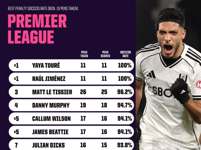 希门尼斯英超点球纪录再创新高,11罚11中!